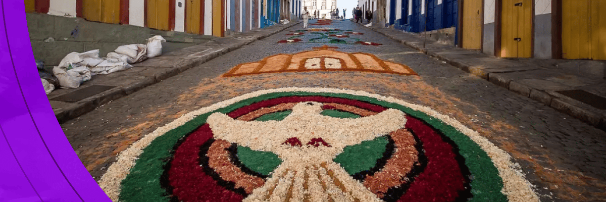 Em muitas cidades, as ruas se transformam em obras de arte com os tradicionais tapetes coloridos. Essa celebração católica, que chegou ao Brasil com os colonizadores, é marcada por missas e procissões.